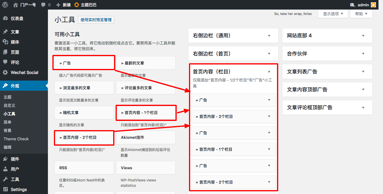 请将“首页内容 - 1/2个栏目”和“广告”小工具添加到